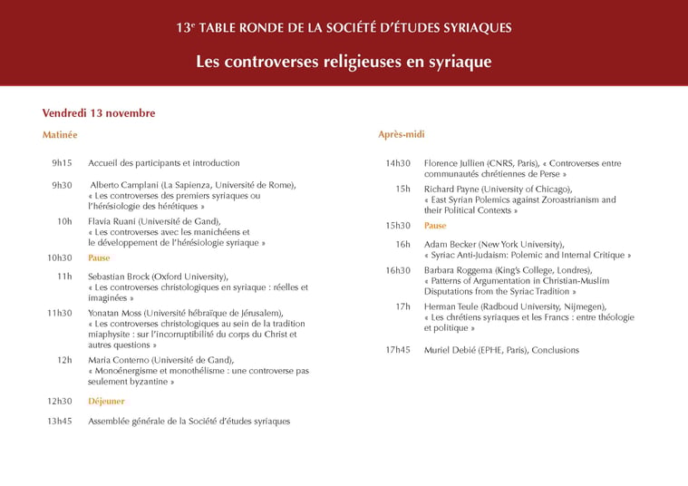 La 13e table ronde de la Société d'études syriaques a eu lieu vendredi 13 novembre 2015 sur le thème Les controverses religieuses en syriaque (organisé par Muriel Debié et Flavia Ruani).